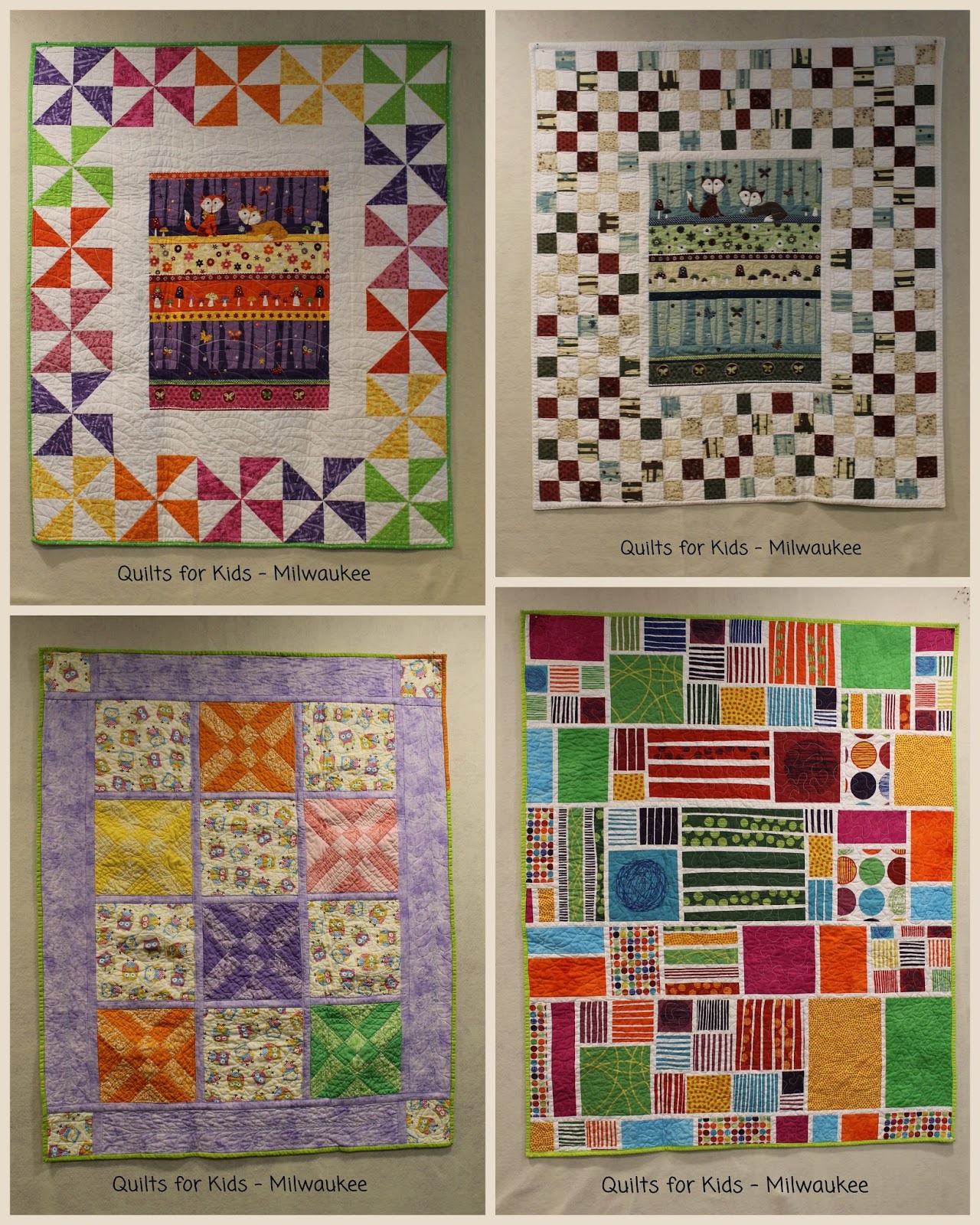 Some of our volunteers drove in all the way from Door County for today's sew day. They brought plenty of finished quilts along. It's so fun and inspiring to see the variety of fabrics and quilt patterns used to make these beauties.